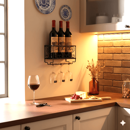 Wall-Mounted Wine Rack with Glass Holder – Rustic Metal Bottle Shelf for Home Bar & Kitchen Décor