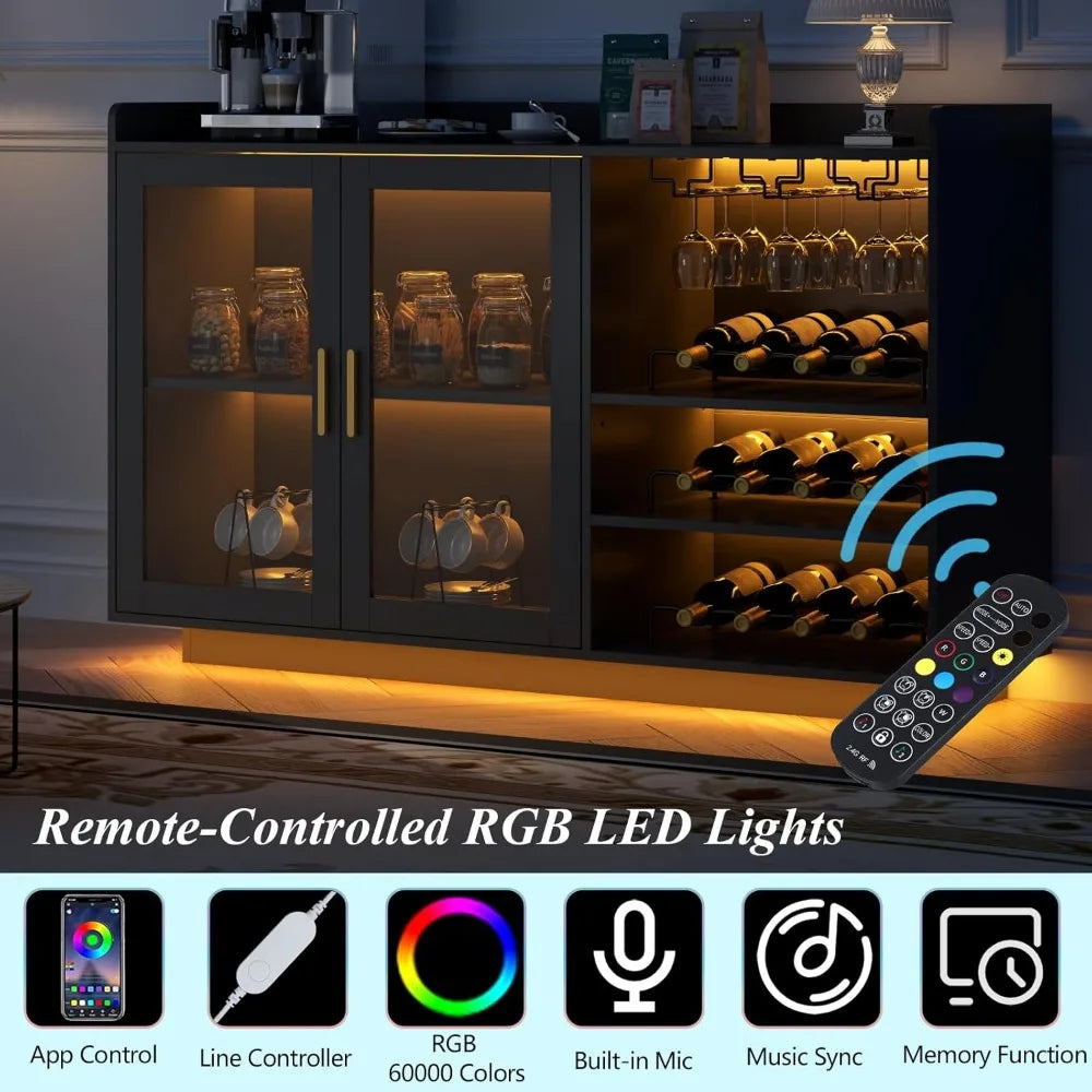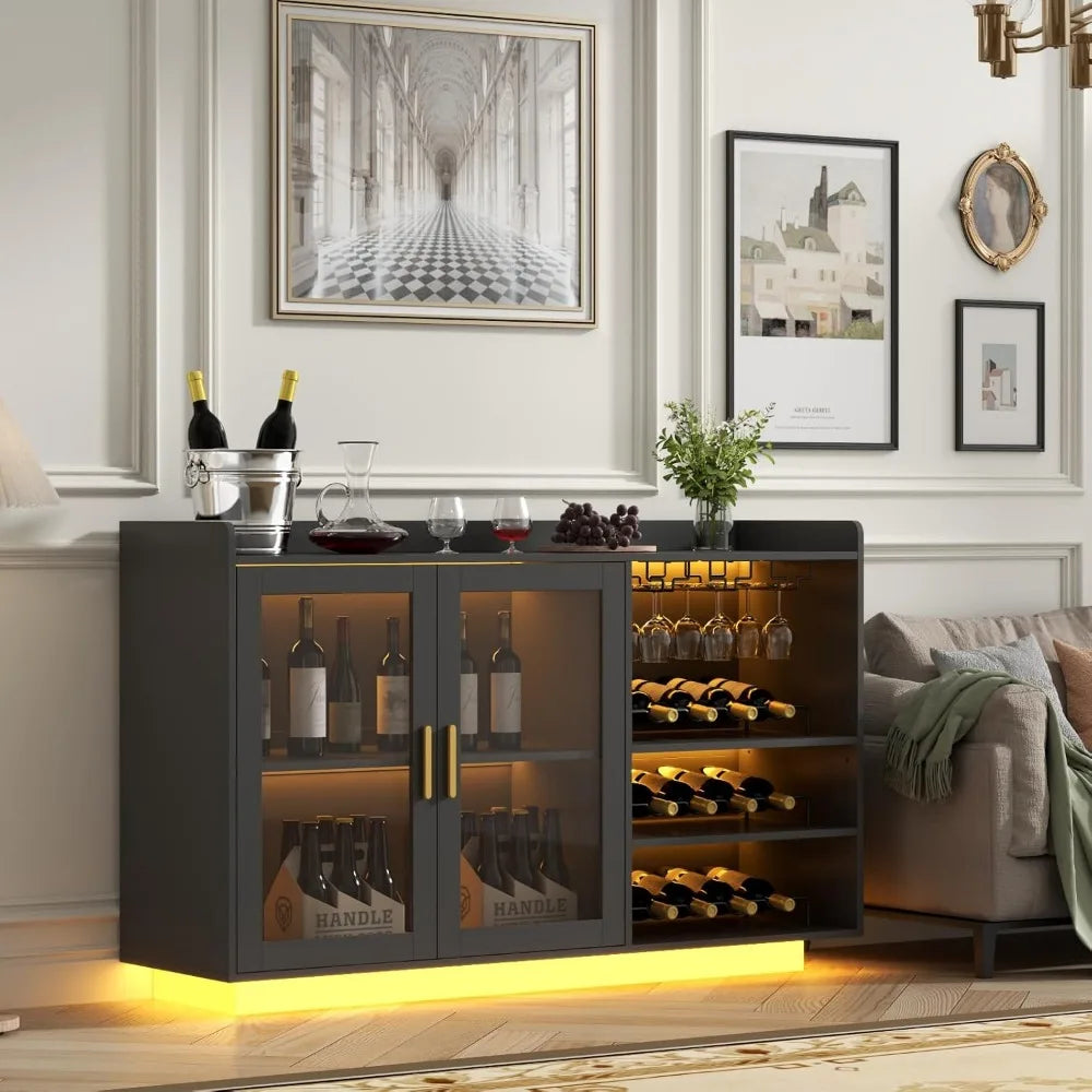 Featuring tempered transparent glass doors, is ideal for showcasing your wine collection, glassware, and bar accessories for enhancing visibility and adding a touch of elegance to your display.